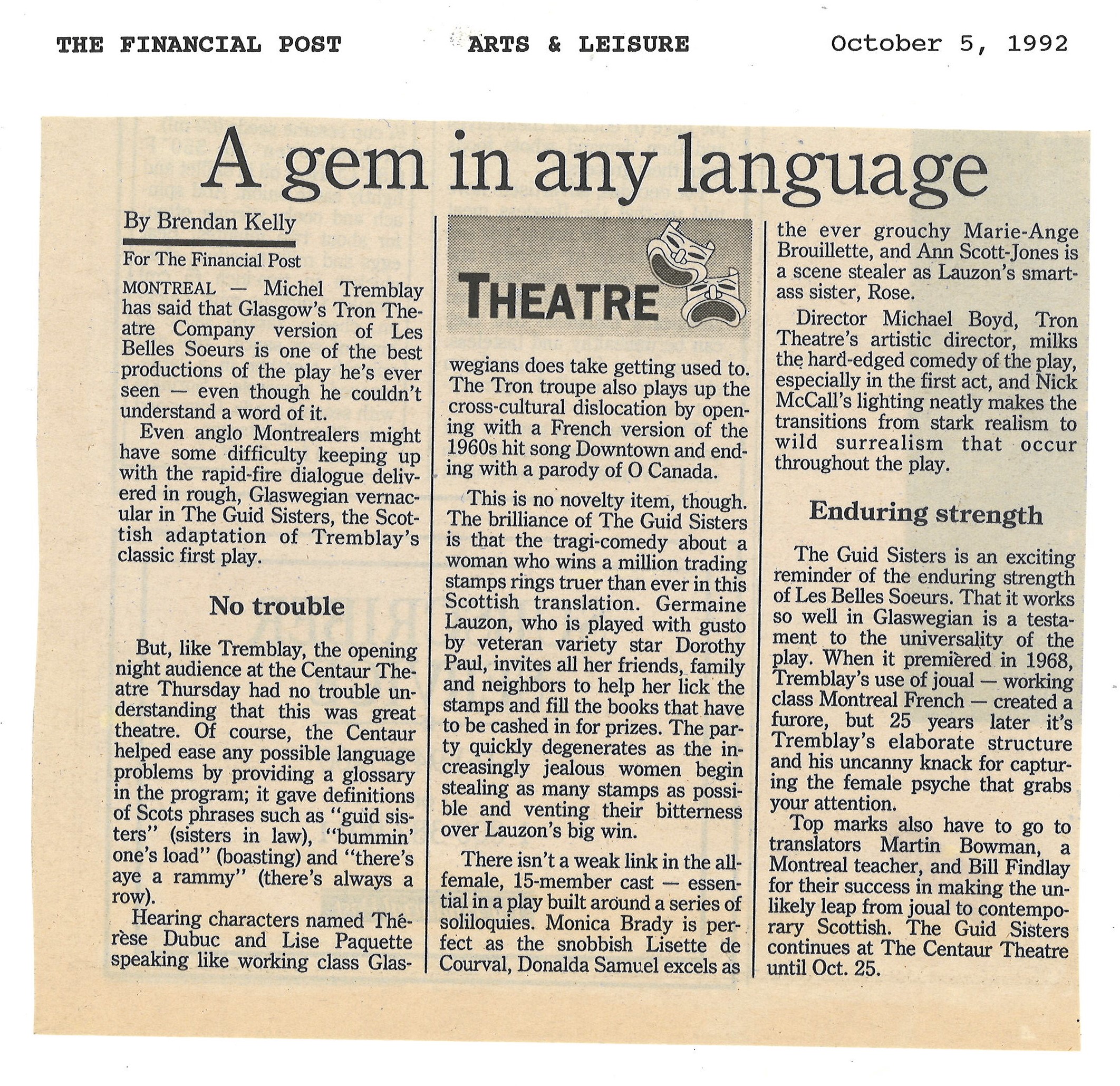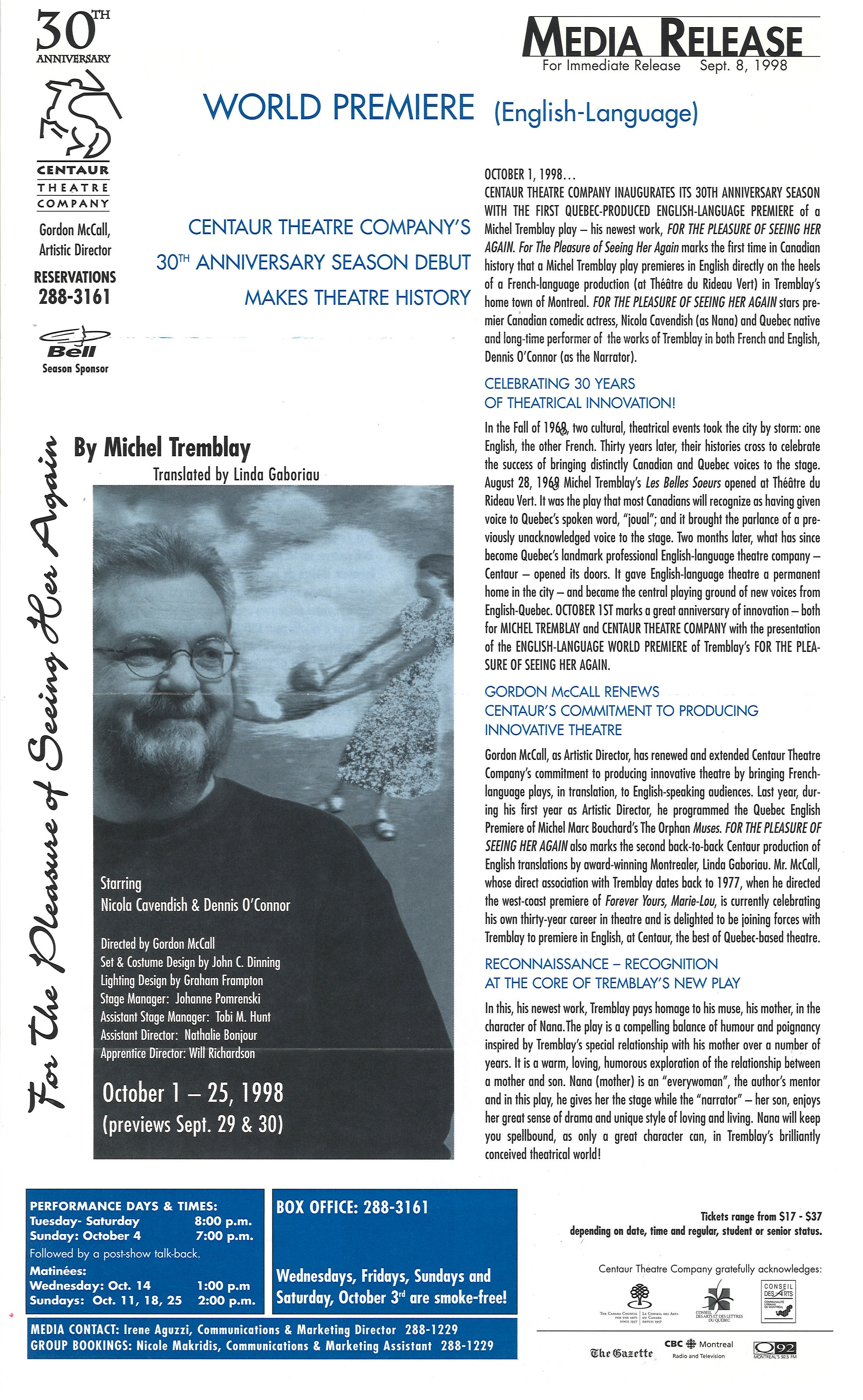 Over the years, Centaur Theatre has established itself as the meeting point between Quebec’s Anglophone community and Michel Tremblay’s plays by staging numerous translations of his works. The first was Albertine in Five Times (Albertine, en cinq temps) in 1985, which opened our 17th season. Several others followed, such as The Guid Sisters (Les Belles-Sœurs) in 1992, For the Pleasure of Seeing Her Again (Encore une fois, si vous permettez) in 1998, Past Perfect (Le Passé antérieur) in 2003, Assorted Candies (Bonbons assortis) in 2006, Forever Yours, Marie-Lou (À toi, pour toujours, ta Marie-Lou) in 2008, and Hosanna in 2018. Our production of the English-language world premiere of For the Pleasure of Seeing Her Again in 1998 was one of the most popular in our history, even going on to tour North America. We are thrilled to be staging this beautiful play once again and to have the opportunity to introduce Tremblay’s work to the next generation of theatre lovers.